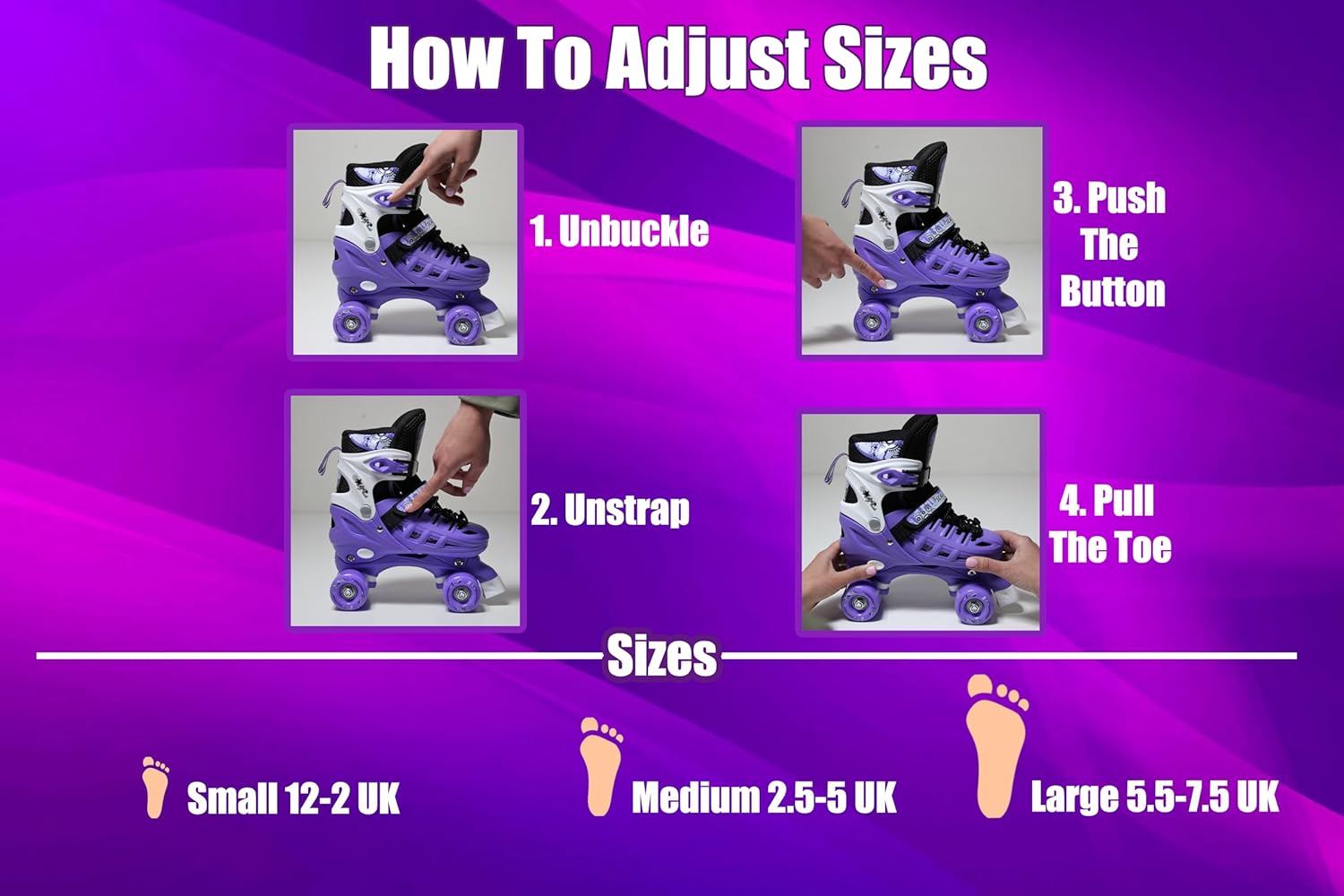 A pair of boots can be adjusted to different sizes when children's feet grow to ensure years of fun. Simply press a button to adjust inline skates fit the feet. Our roller skates come in 3 shoe sizes: S (regulated UK C11-1.5 EU 30-33 (180-205 mm), M (regulated UK 2-4.5 EU 34-37 (207-235 mm) and L (regulated UK 5-7 EU 38-41 (235-255 mm).