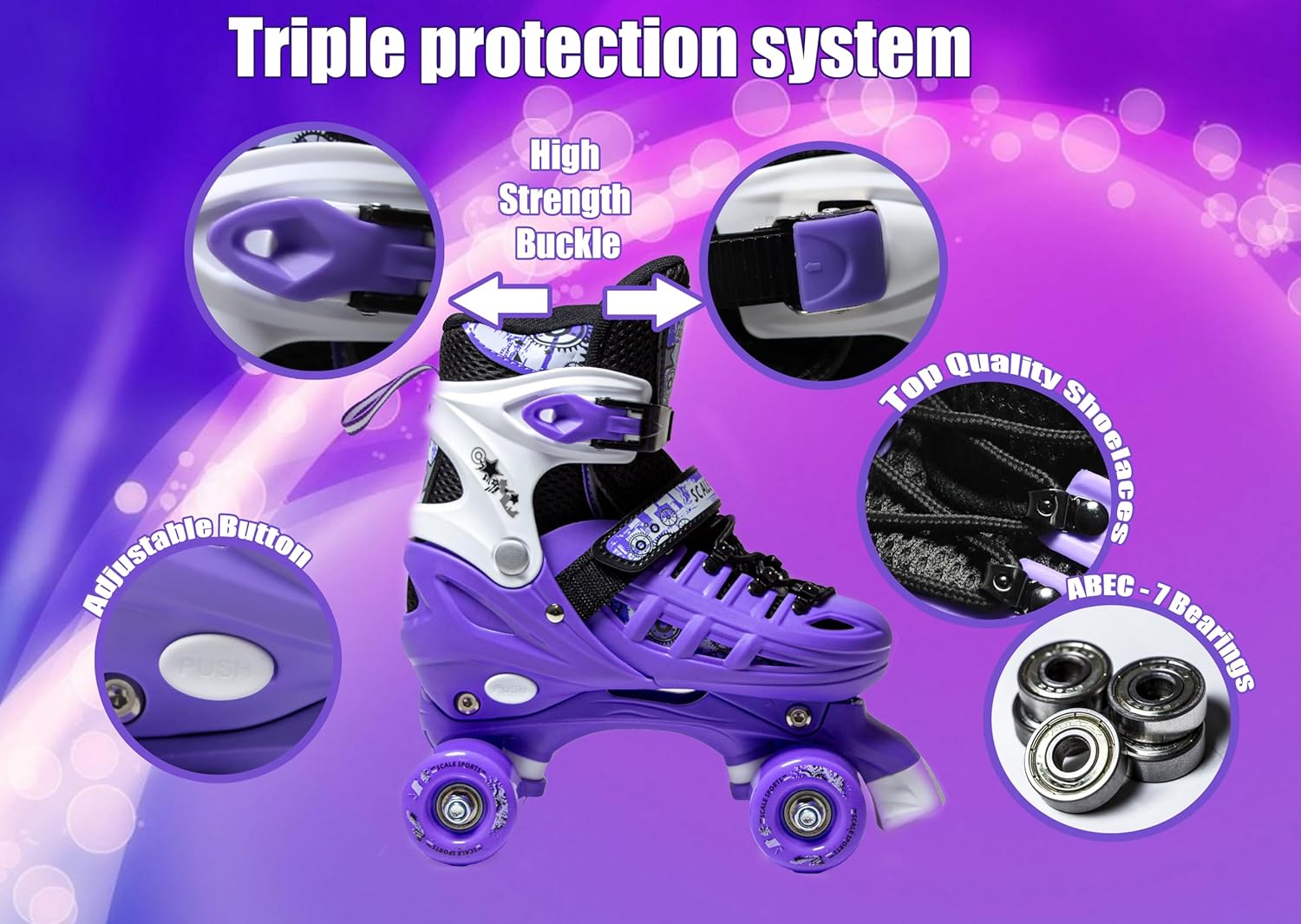 3 sizes Adjustable Quad Roller Skates for boys and girls | Purple
