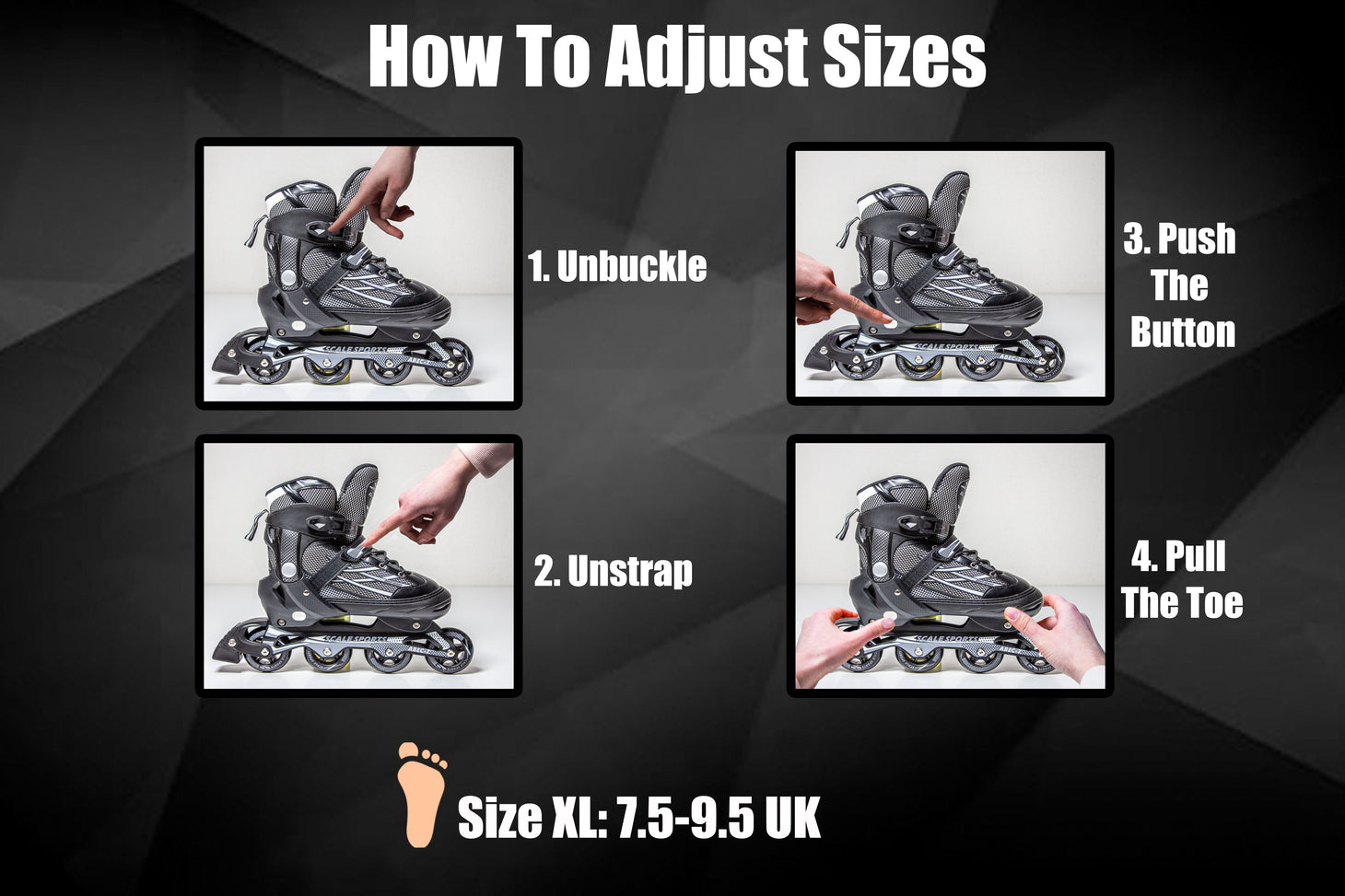 The Scale Sports 0935 inline skates feature a simple 4-step adjustment system: