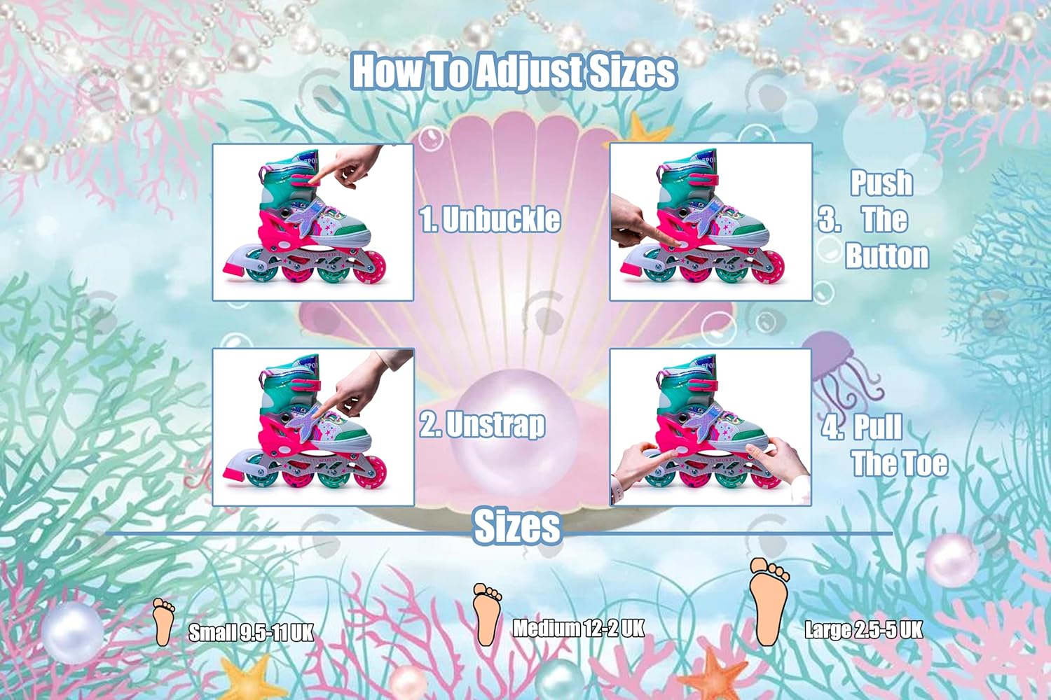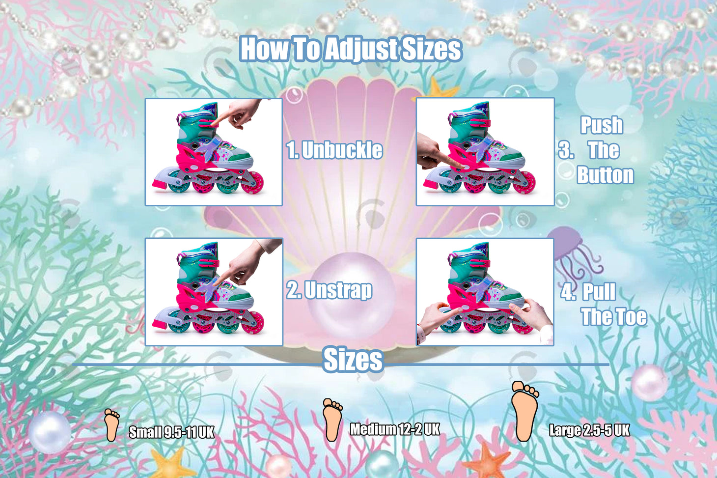 These Scale Sports Mermaid Inline Skates are designed to grow with your child. Easily adjust the size in four simple steps: