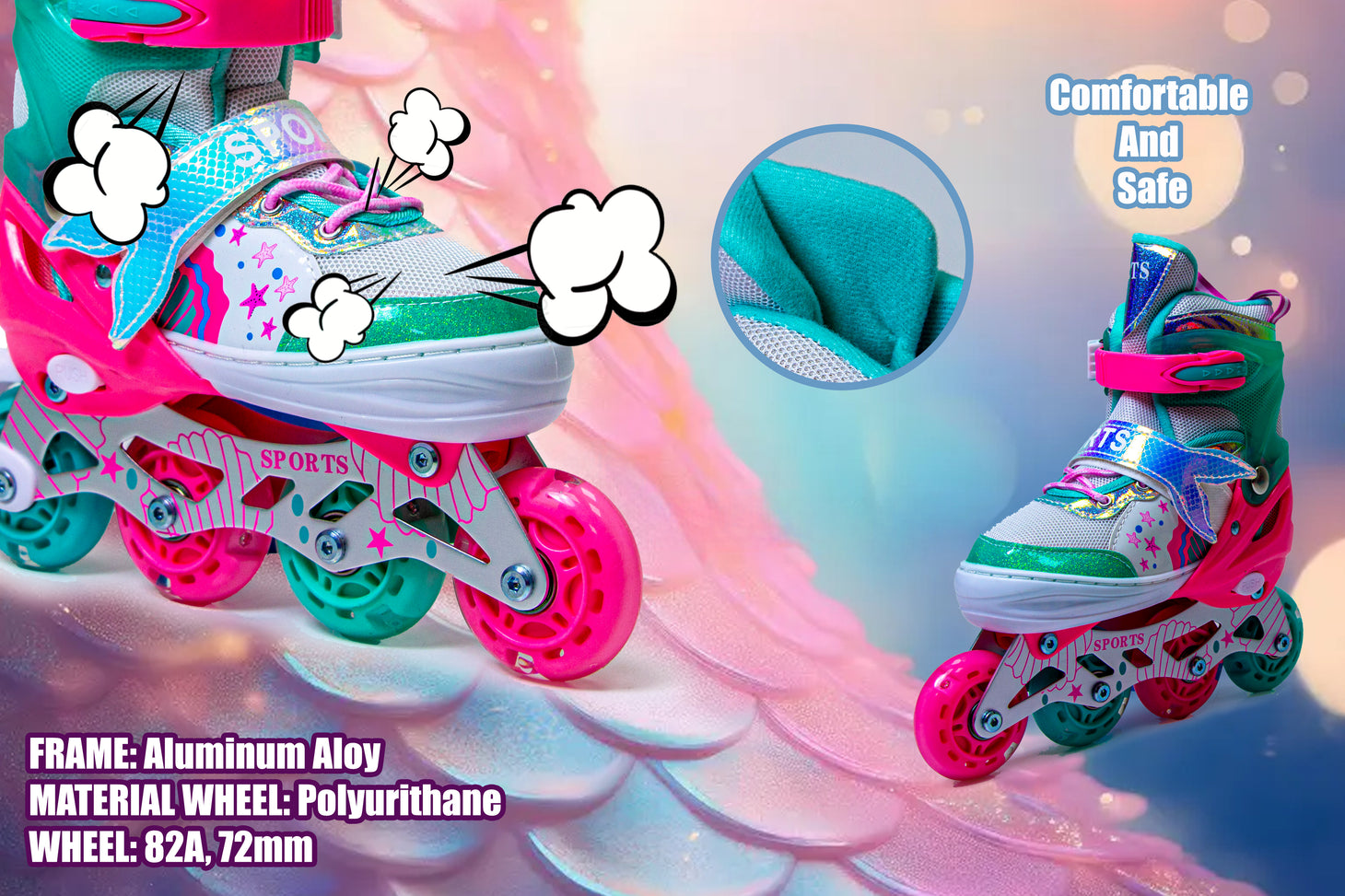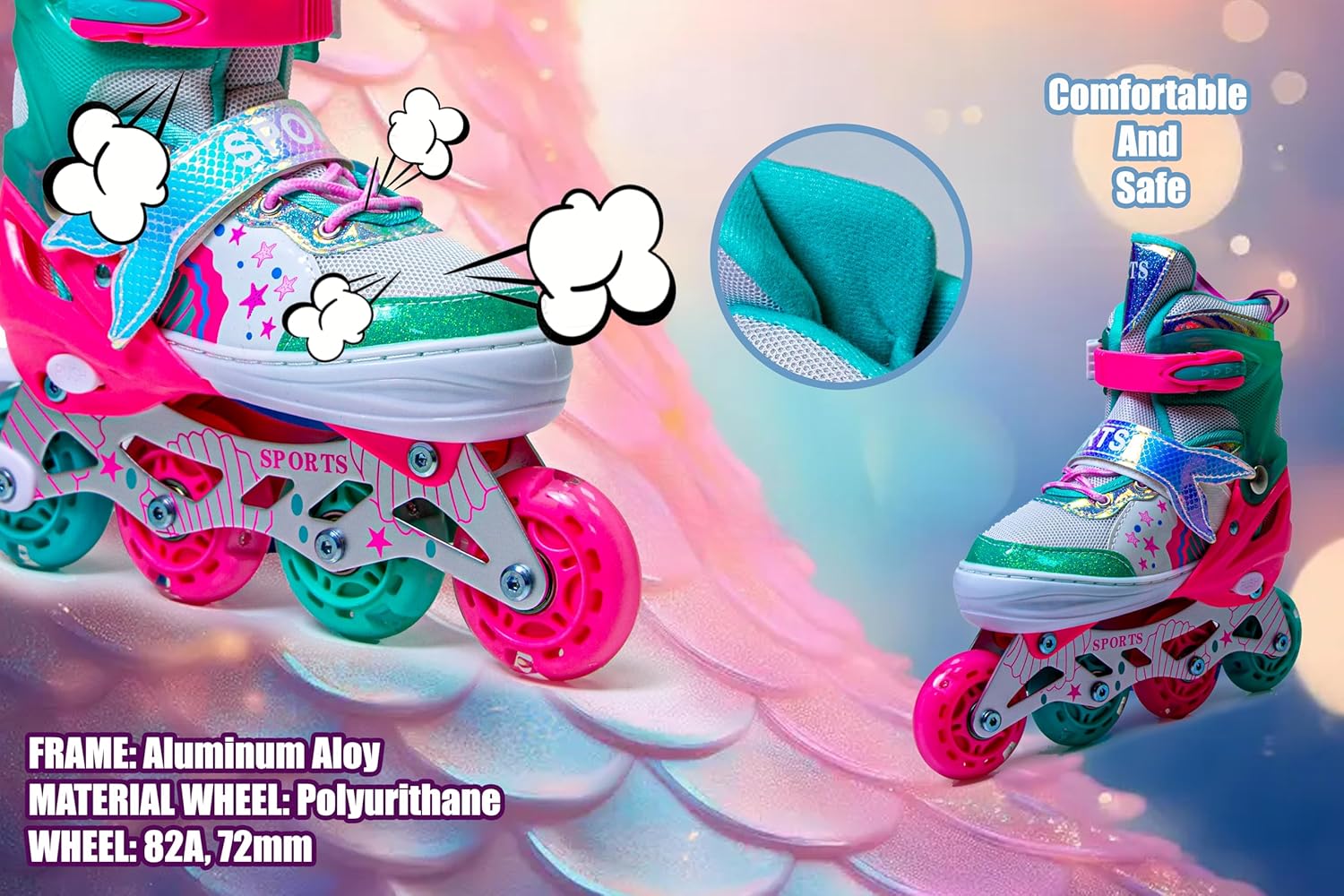 The Scale Sports Mermaid Inline Skates are crafted with a high-strength aluminium alloy frame and 82A polyurethane wheels (72 mm) for long-lasting performance. The soft, breathable inner padding keeps your child comfortable during every ride, while the reinforced structure ensures safety and durability both indoors and outdoors.