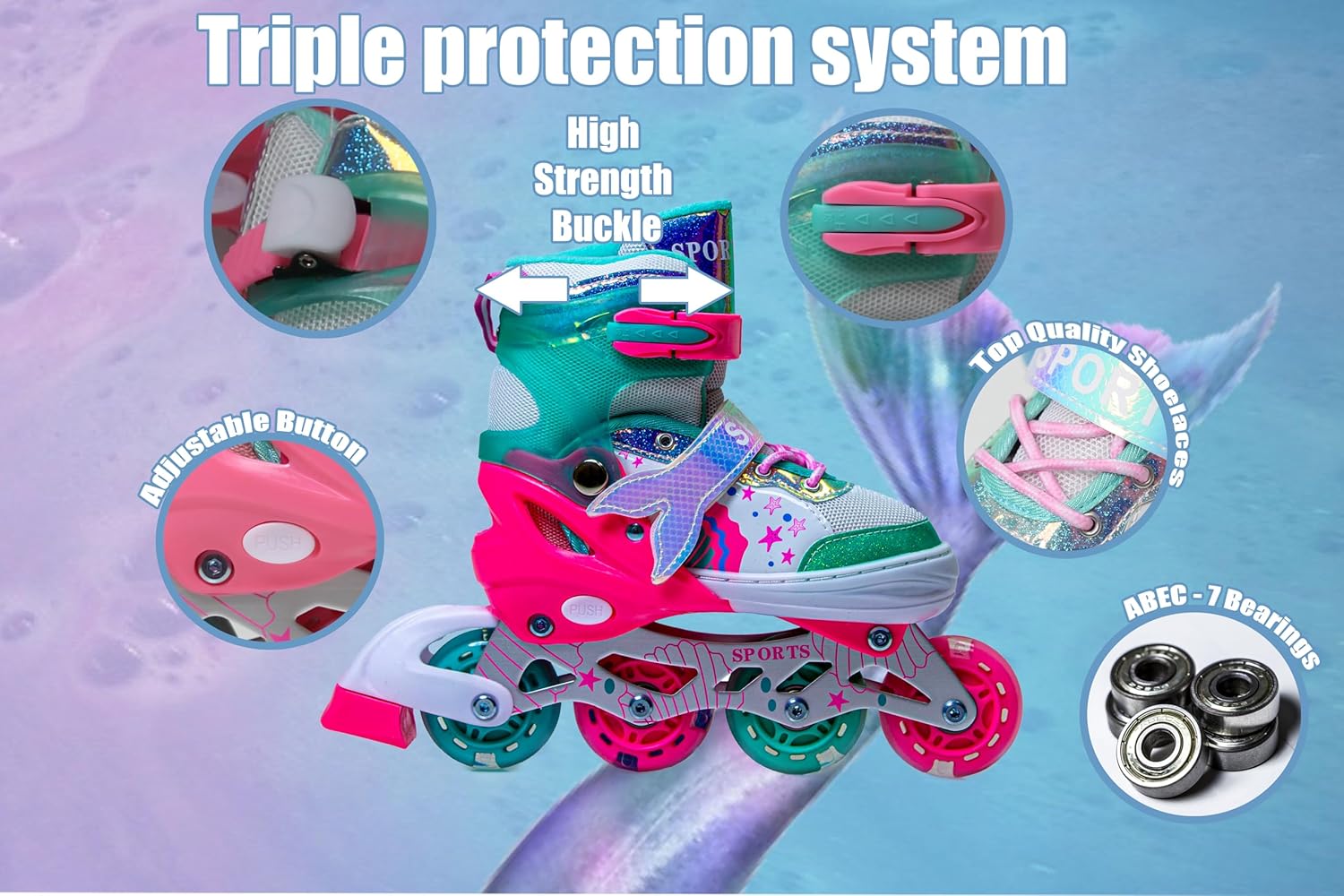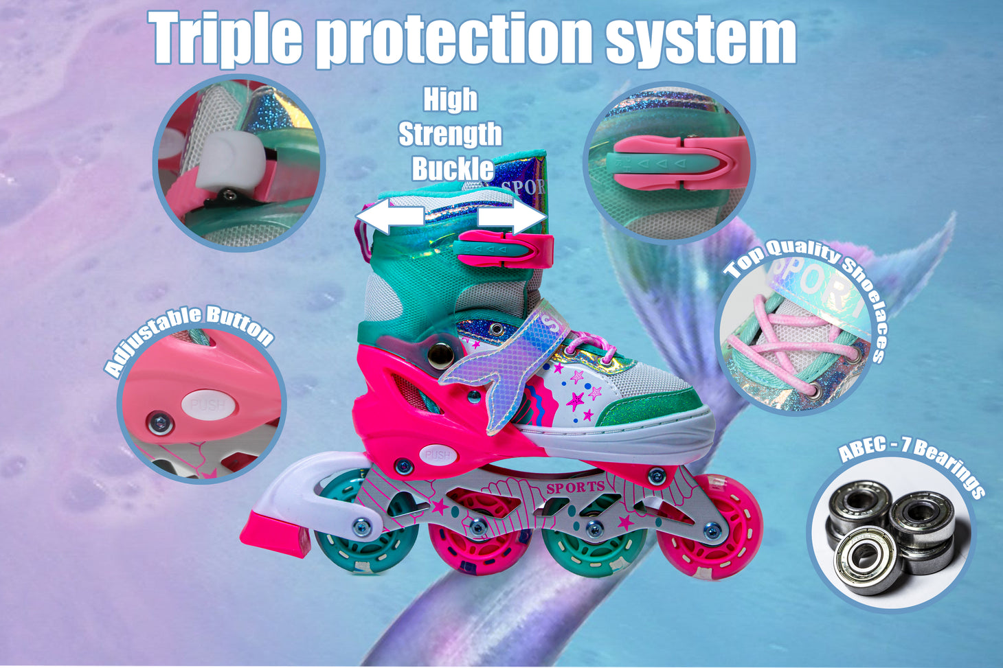 These Scale Sports Mermaid Inline Skates feature a reliable triple safety system to keep your child secure while skating. The design includes a strong adjustable buckle, top-quality shoelaces and a durable strap for ankle support and stability.