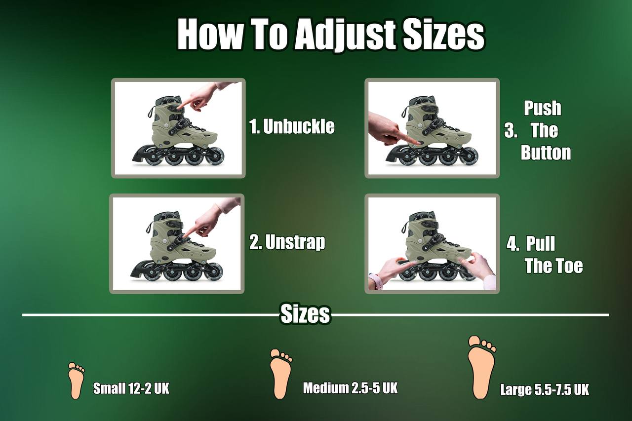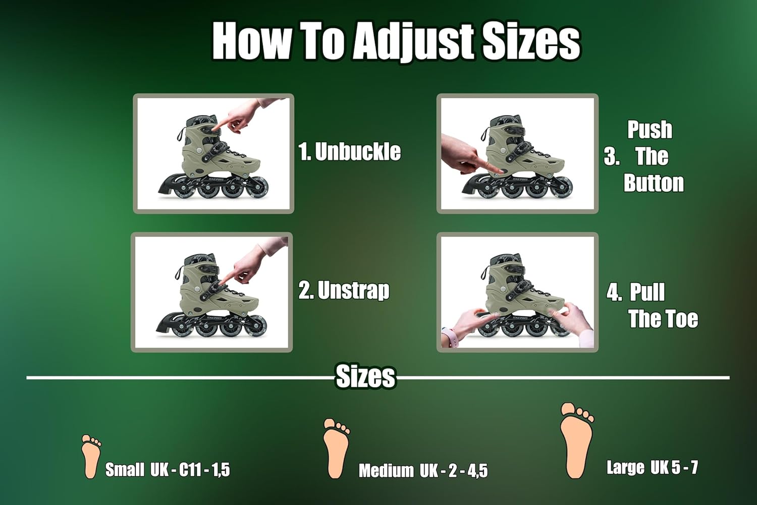 Our roller skates inline are designed to grow with your child, featuring adjustable sizes that make them perfect for both children and adults. Choose from three adjustable sizes: Small (UK C11-1.5, EU 30-33), Medium (UK 2-4.5, EU 34-37) and Large (UK 5-7, EU 38-41)