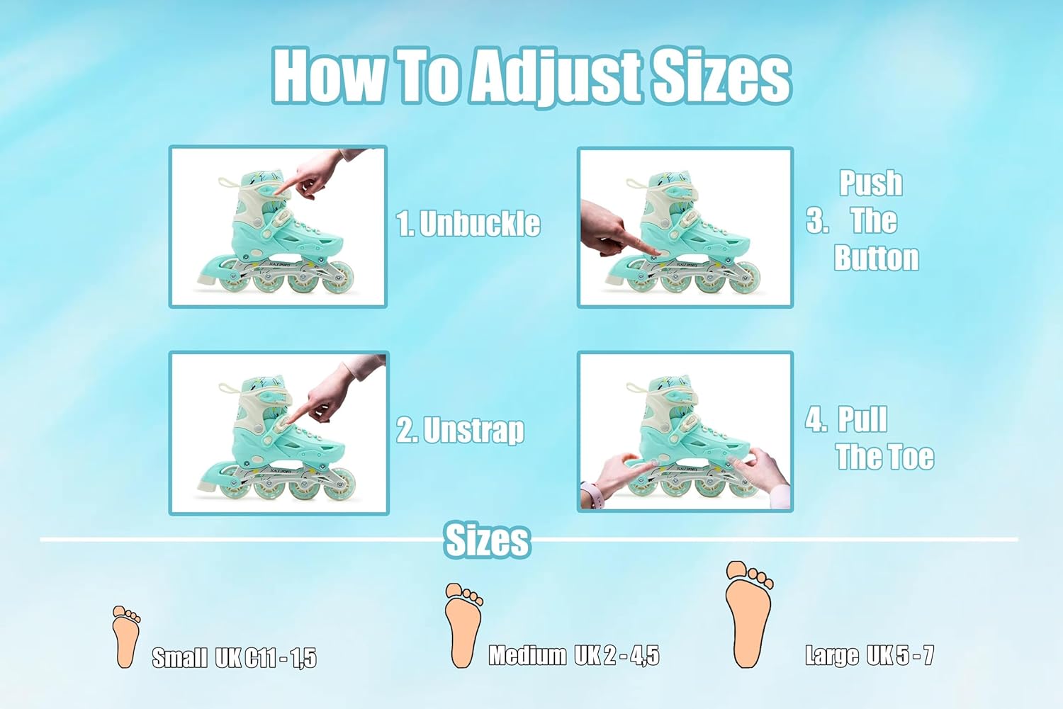 Our inline roller skates are designed to grow with your child, featuring adjustable sizes that make them perfect for both children and adults. Choose from three adjustable sizes: Small (UK C11-1.5, EU 30-33), Medium (UK 2-4.5, EU 34-37), and Large (UK 5-7, EU 38-41)