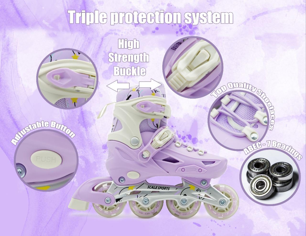 Soft breathable inner padding combined with a reinforced aluminium frame ensures long-lasting comfort and protection. - Smooth Performance:Premium ABEC-7 bearings deliver a quiet, stable and smooth ride – perfect for both beginners and confident skaters.