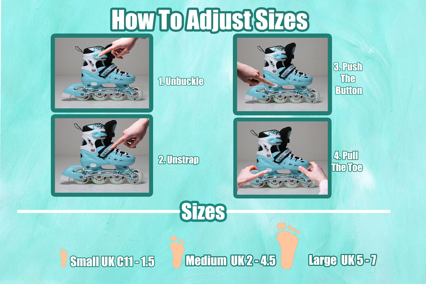 Choosing the right size has never been easier. Scale Sports 905 skates are designed to grow with your child, providing a comfortable and secure fit at every stage. Our skates adjust to three UK size ranges using a simple push-button system:
