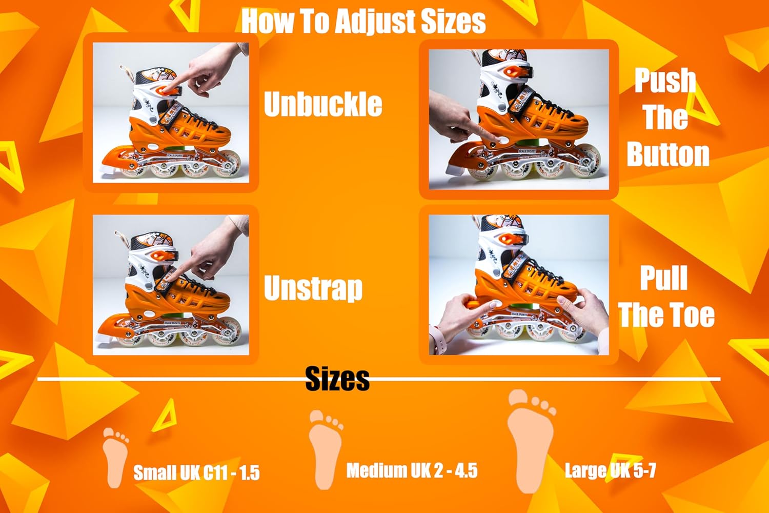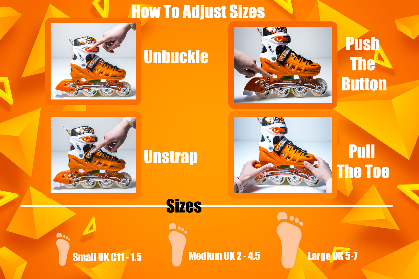 Scale Sports skates are designed to grow with your child. Adjusting the size is fast and simple: