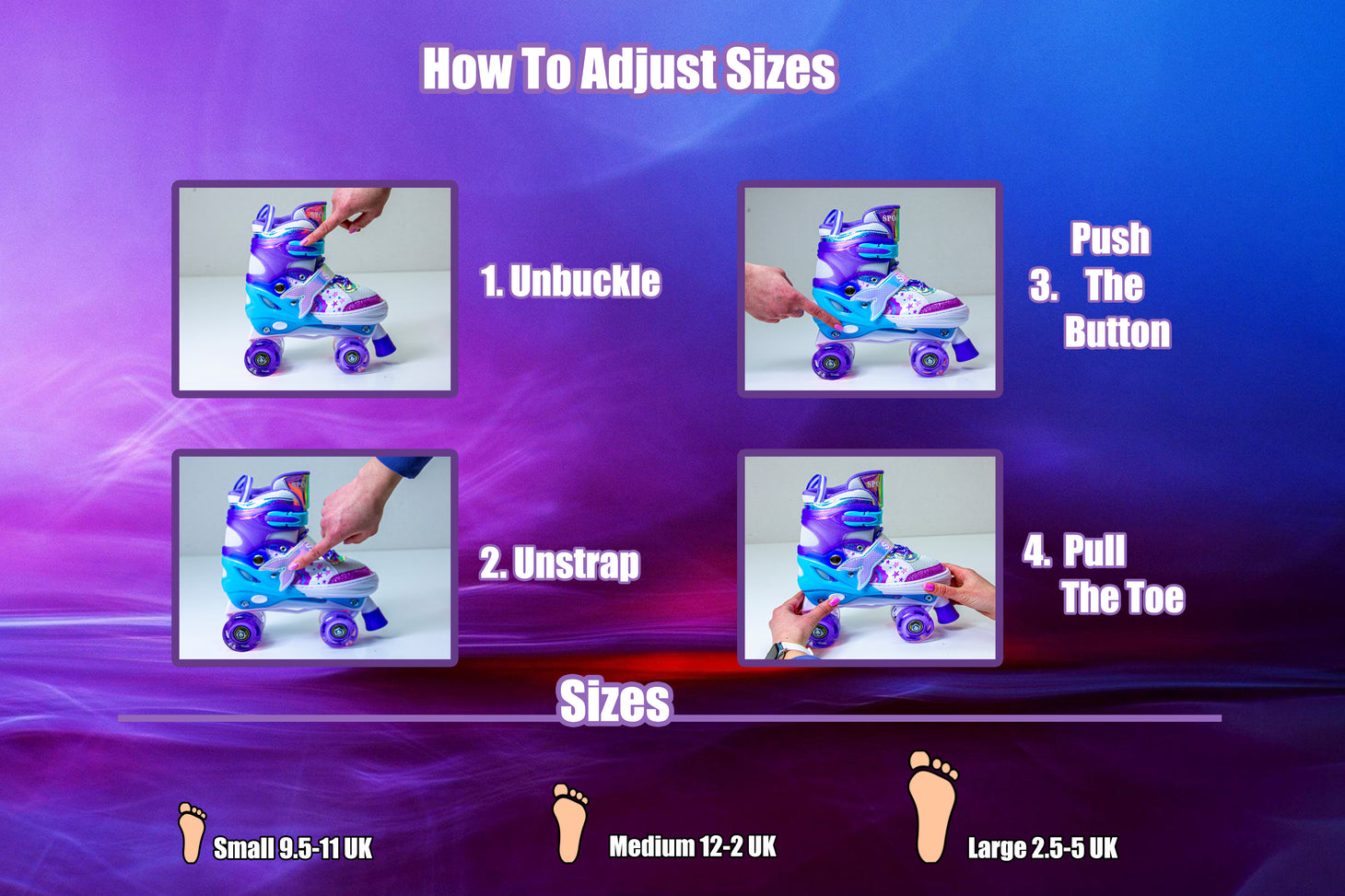 Adjusting your child’s roller skates has never been easier! The Scale Sports Mermaid skates feature a simple 4-step system to ensure the perfect fit as your child grows. Just unbuckle the top strap, release the Velcro, press the size adjustment button, and pull the toe forward. These adjustable quad skates are available in three sizes: Medium (UK 12–2), and Large (UK 2.5–5). Perfect for growing feet, these skates offer long-term comfort, safety, and fun for kids aged 3 to 12.